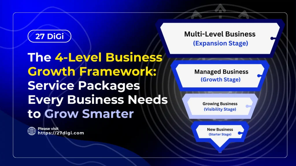 To solve this confusion, 27 DIGI has developed a clear business growth framework paired with specialized service packages for each business level. Each package focuses on exactly what a business needs at that stage—saving money, increasing efficiency, and maximizing results.